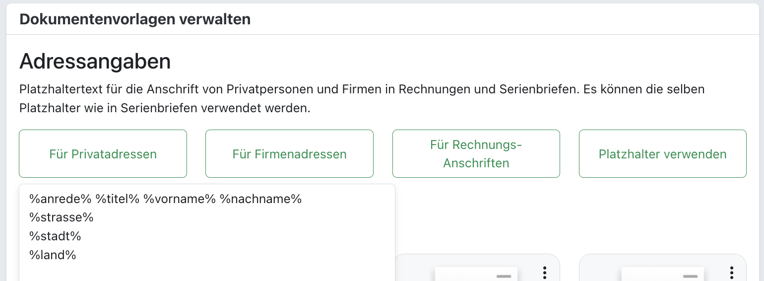 Im Bereich der Adressangaben definiert ihr, welche Inhalte die Empfängerdaten eurer PDF-Dokumente enthalten sollen. Unterschieden wird zwischen Privatadressen, Firmenadressen und separaten Rechnungsanschriften. Rechts könnt ihr die Liste verfügbarer Platzhalter öffnen, diese kopieren und dann in die Bereiche links einfügen.