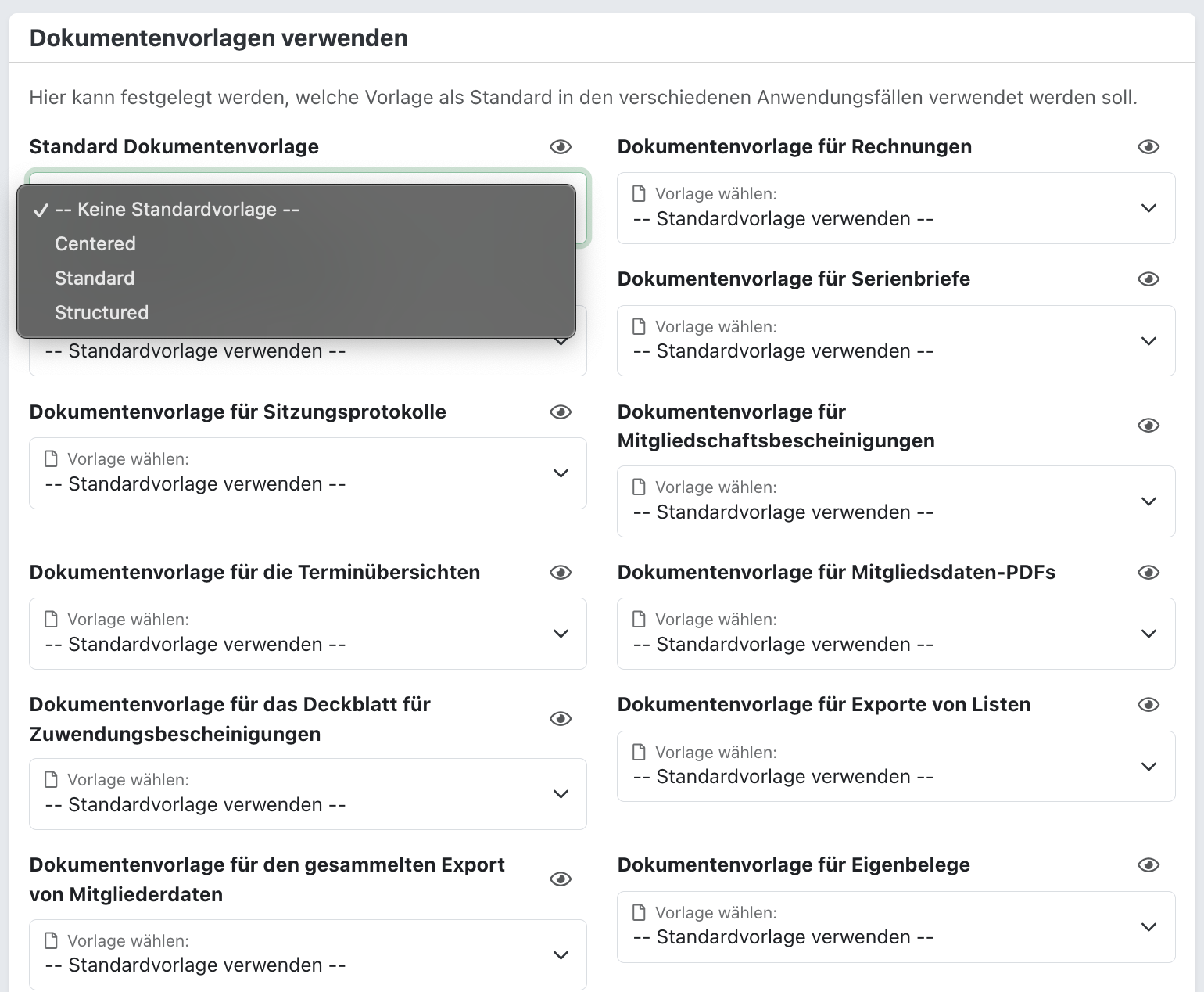 Für die verschiedenen Anwendungsfälle von Dokumentenvorlagen (Briefe, Rechnungen, Sitzungsprotokolle etc.) könnt ihr jeweils individuell die gewünschte Vorlage aktivieren über den Icon mit dem Auge direkt eine Vorschau öffnen:
