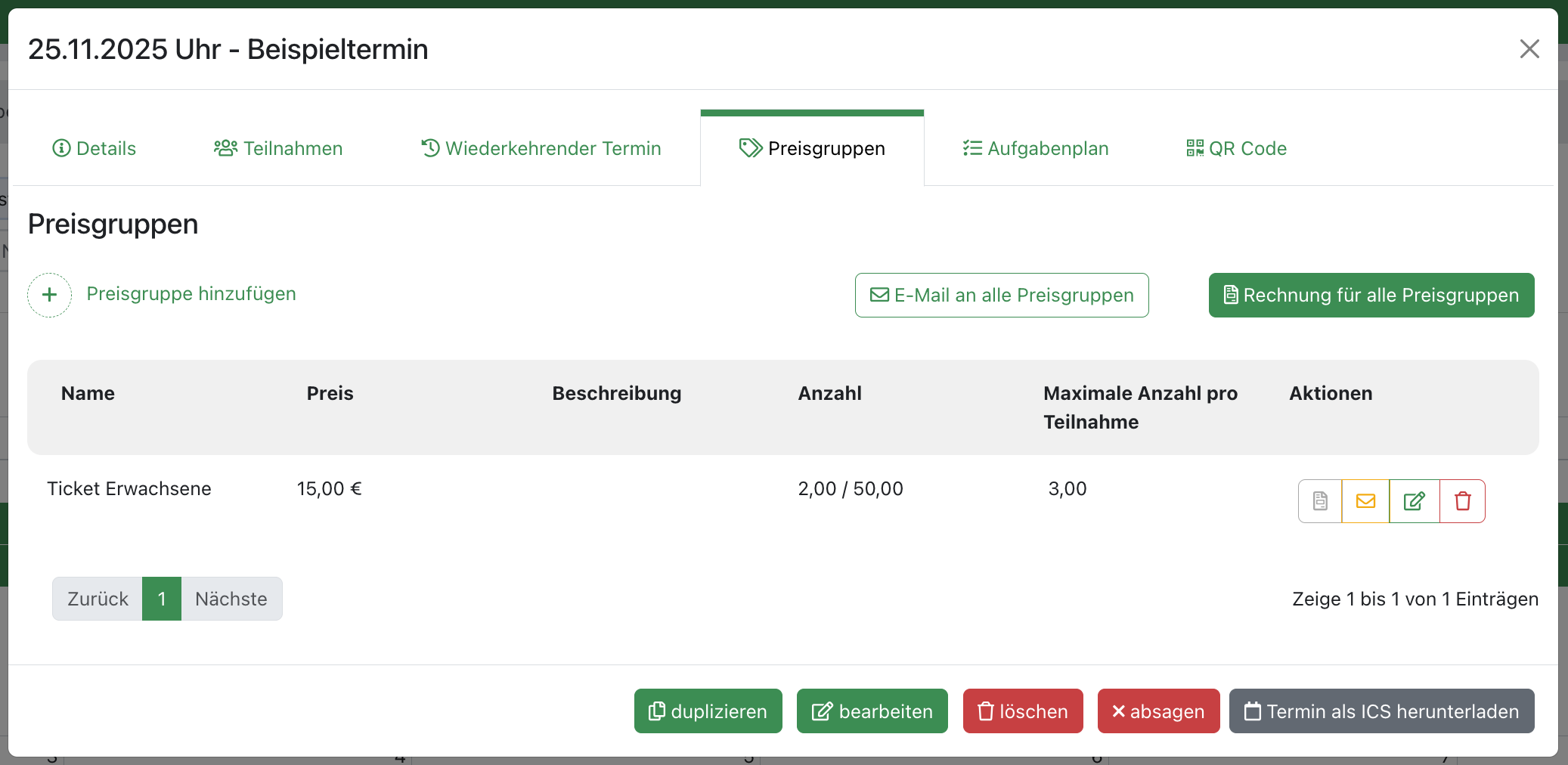 Für kostenpflichtige Veranstaltungen könnt ihr hier eine oder verschiedene Preisgruppen mit verfügbarer Anzahl, Preis und Beschreibung hinterlegen. Mitglieder können dann bei ihrer Anmeldung je nach eurer Freigabe eine oder mehrere Preisgruppen auswählen, fügt ein Admin einen Teilnehmer hinzu, können die Preisgruppen ebenfalls ausgewählt werden. Aus Anmeldungen mit Preisgruppen können dann auch schnell und einfach die Rechnungen erzeugt werden, wahlweise einzeln je Preisgruppe oder gesammelt für alle (setzt Modul “Buchhaltung” in der Lizenz voraus).