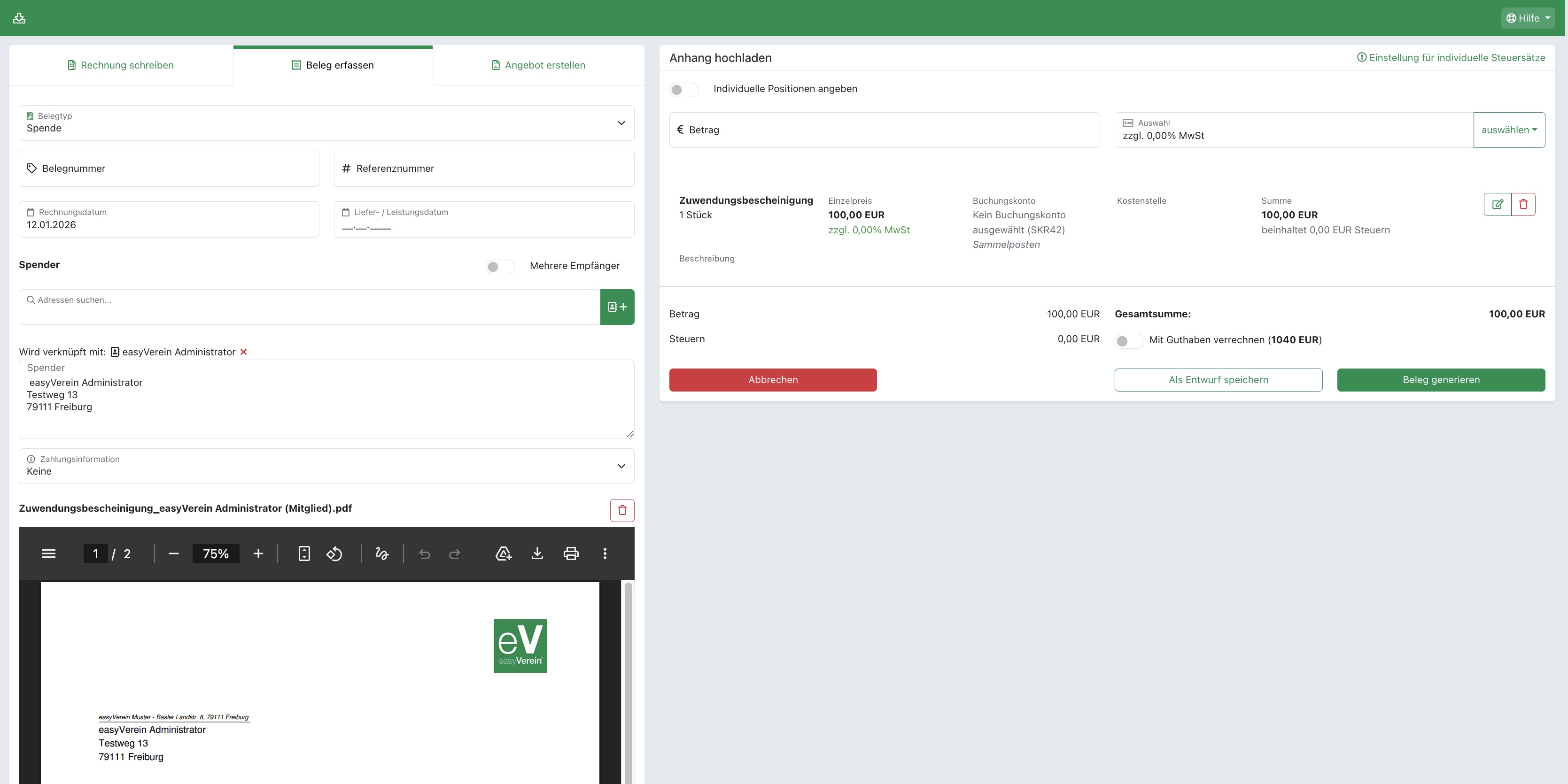 Über "Rechnung / Beleg generieren" wird der Beleg zur Spende erzeugt.