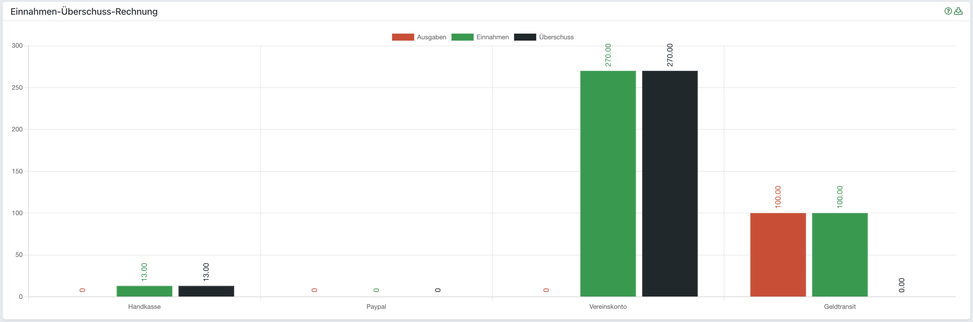 Bitte beachtet, dass die Grafik der Vereinsmittel im Gegensatz zur echten EÜR auch Buchungen auf Bestands- und Statistikkonten berücksichtigt.