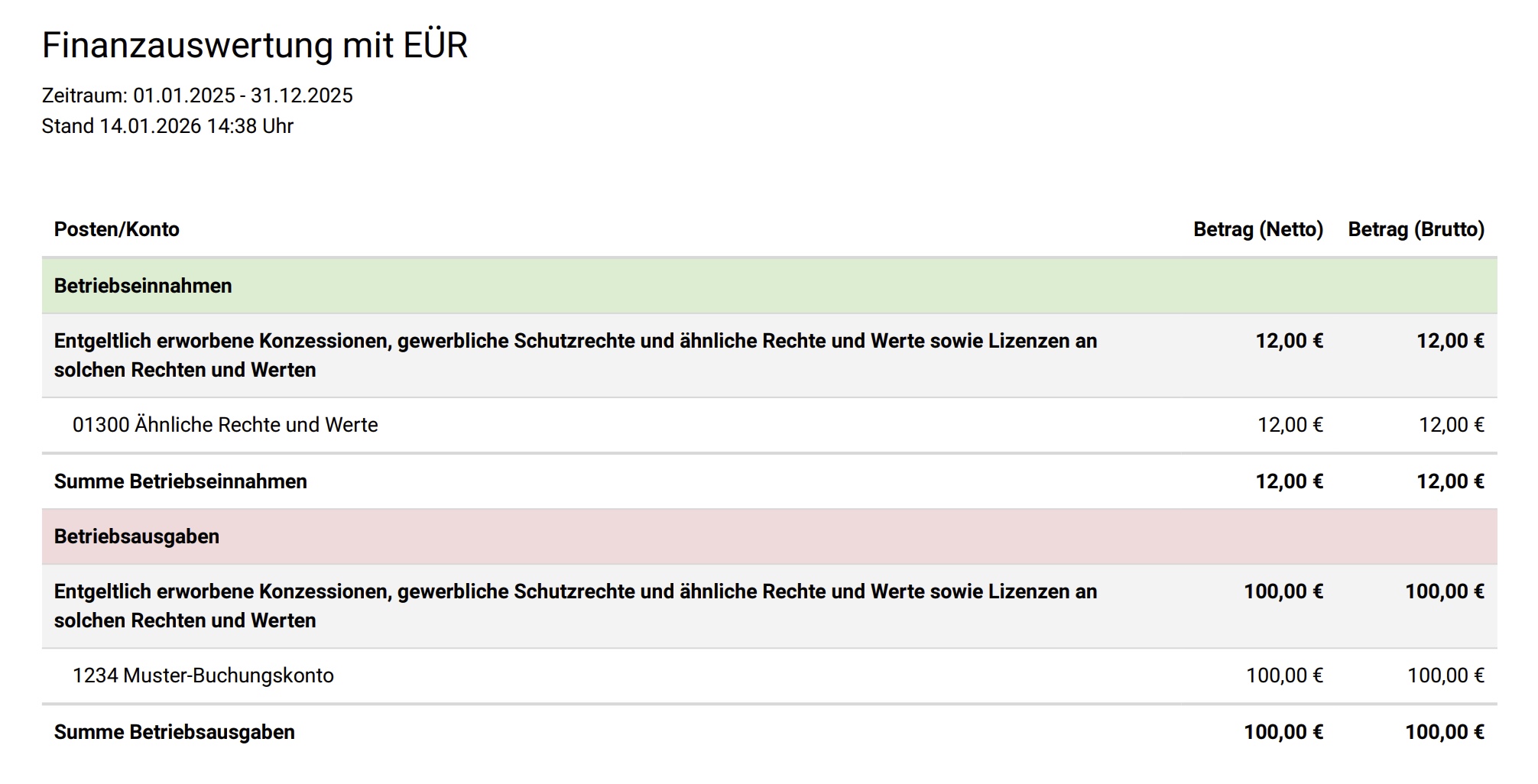 Darunter werden euch alle Betriebseinnahmen und Betriebsausgaben getrennt nach Buchungskonten angezeigt. Folgende Tabellenspalten sind enthalten: