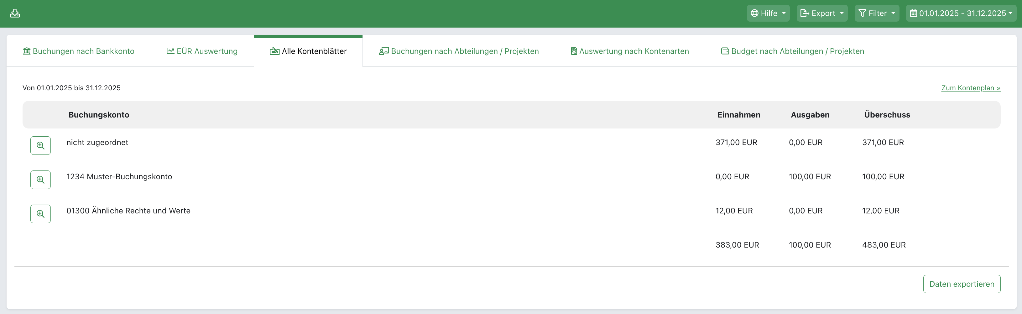 In der Auswertung "Alle Kontenblätter" seht ihr alle Transaktionen auf euren Buchungskonten.