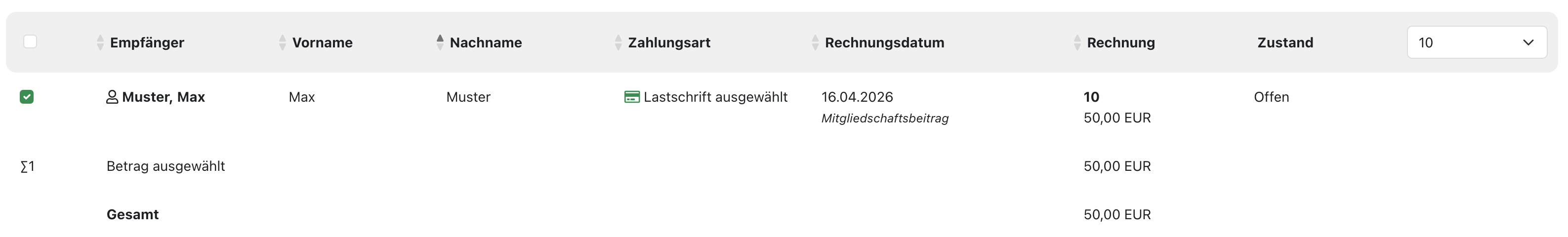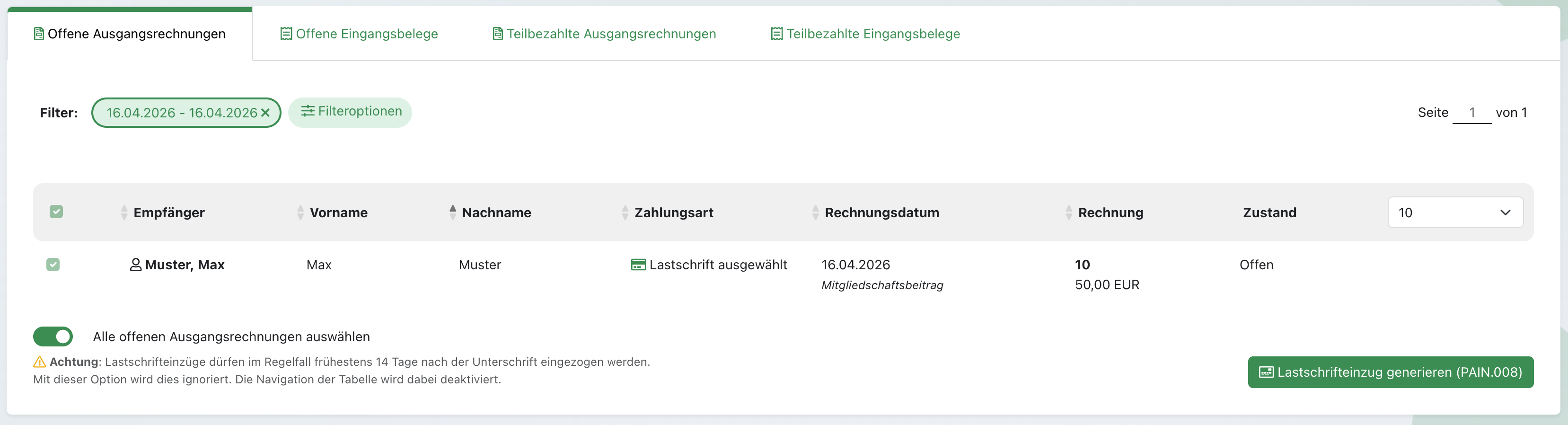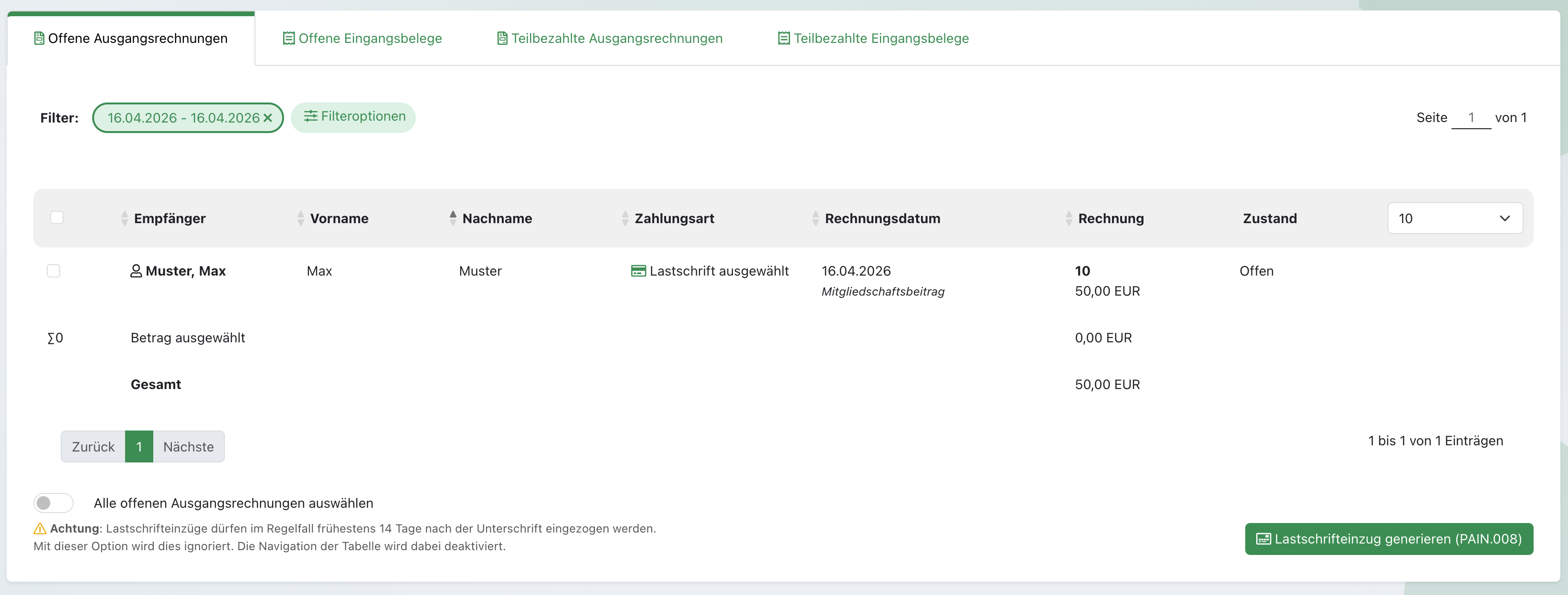 Wir empfehlen, die gewünschten Rechnungen für den Einzug soweit möglich über die Filterfunktion zu filtern. Möchtet ihr beispielsweise alle am 16.04.2026 generierten Rechnungen für Mitgliedsbeiträge einziehen, könnt der Filter so aussehen:
