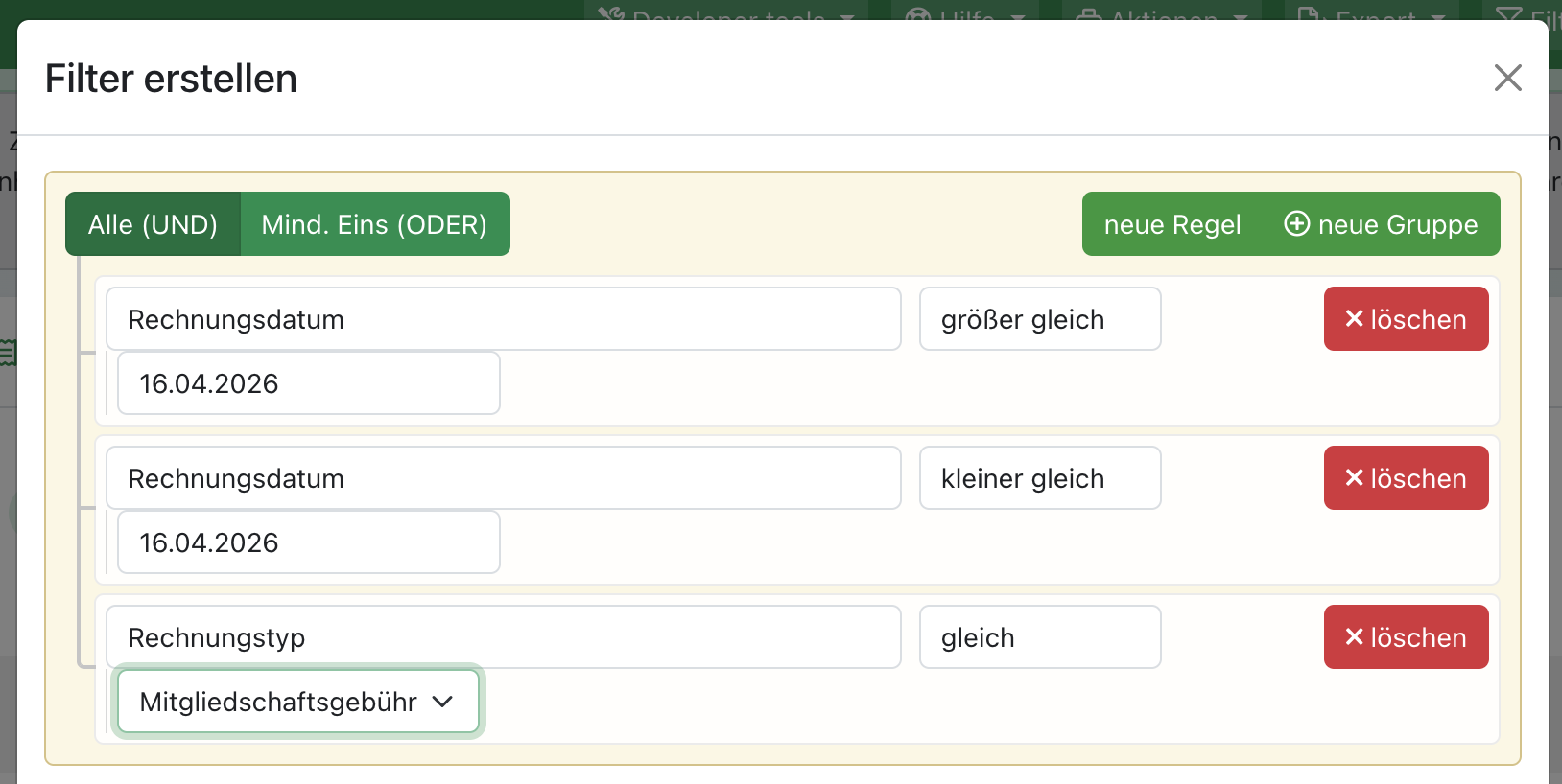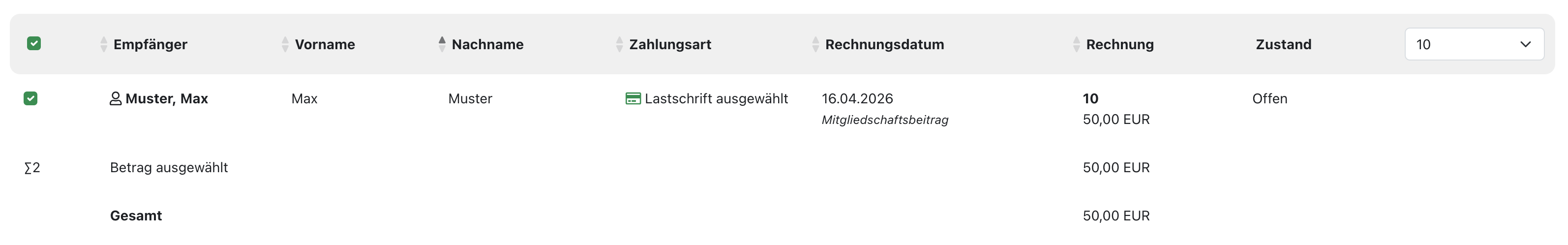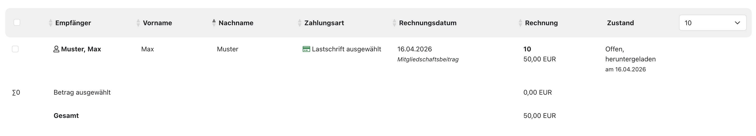 Wir empfehlen, die gewünschten Rechnungen für den Einzug soweit möglich über die Filterfunktion zu filtern. Möchtet ihr beispielsweise alle am 16.04.2026 generierten Rechnungen für Mitgliedsbeiträge einziehen, könnt der Filter so aussehen: