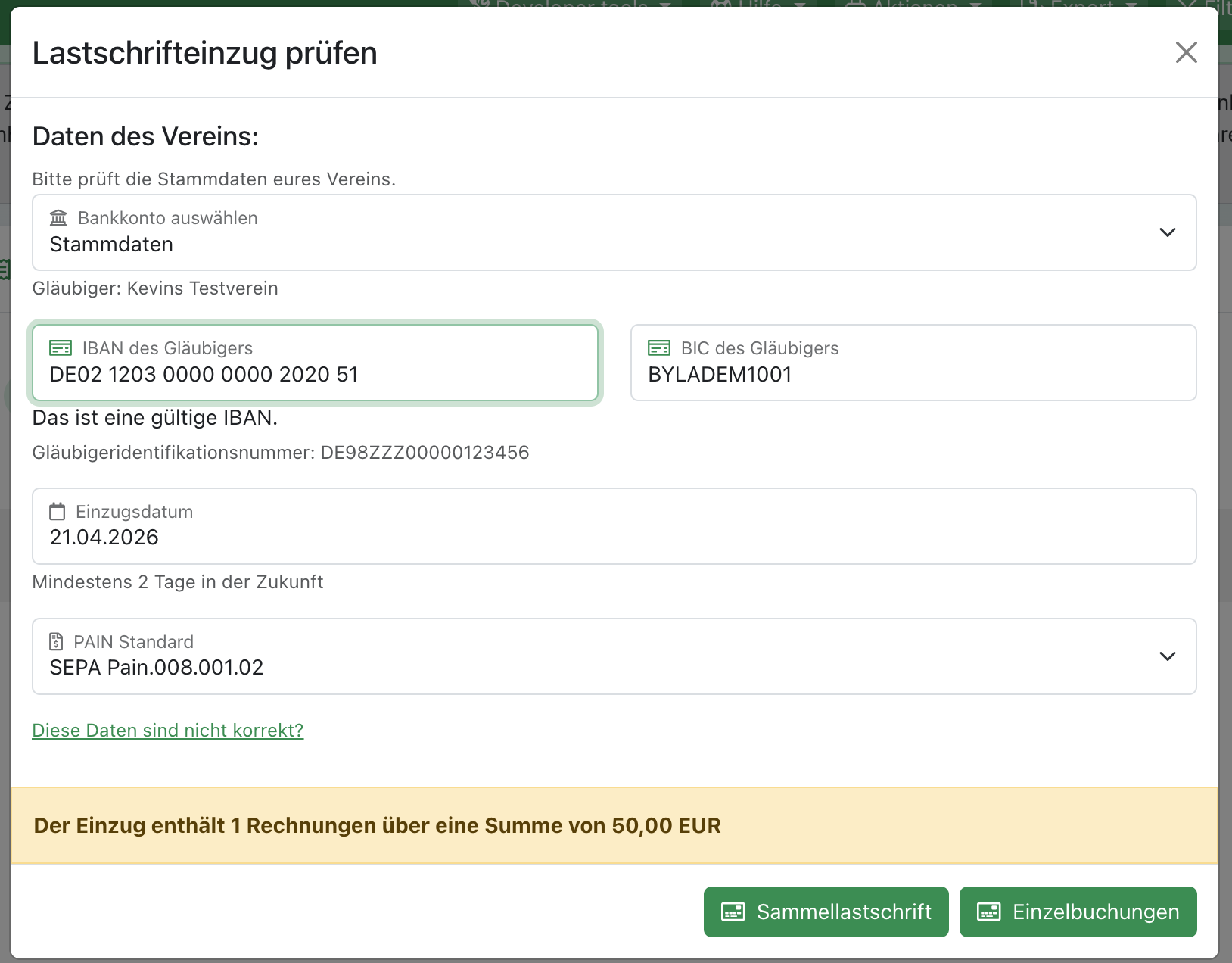 Gläubigeridentifikationsnummer: Sollte hier keine Nummer angezeigt werden, tragt diese in euren Stammdaten nach. Die Gläubiger-ID ist für einen Einzug zwingend notwendig und wurde euch als Verein von der Deutschen Bundesbank erteilt.