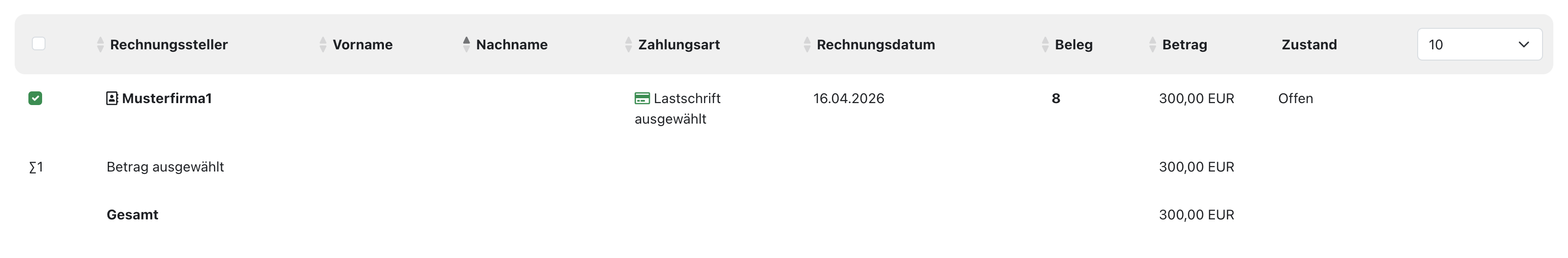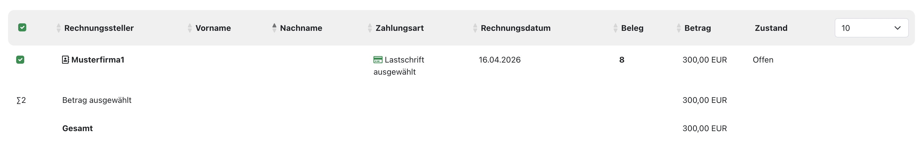 Über die Checkbox oben links in der Tabelle könnt ihr alle Rechnungen der sichtbaren Seite gesammelt auswählen: