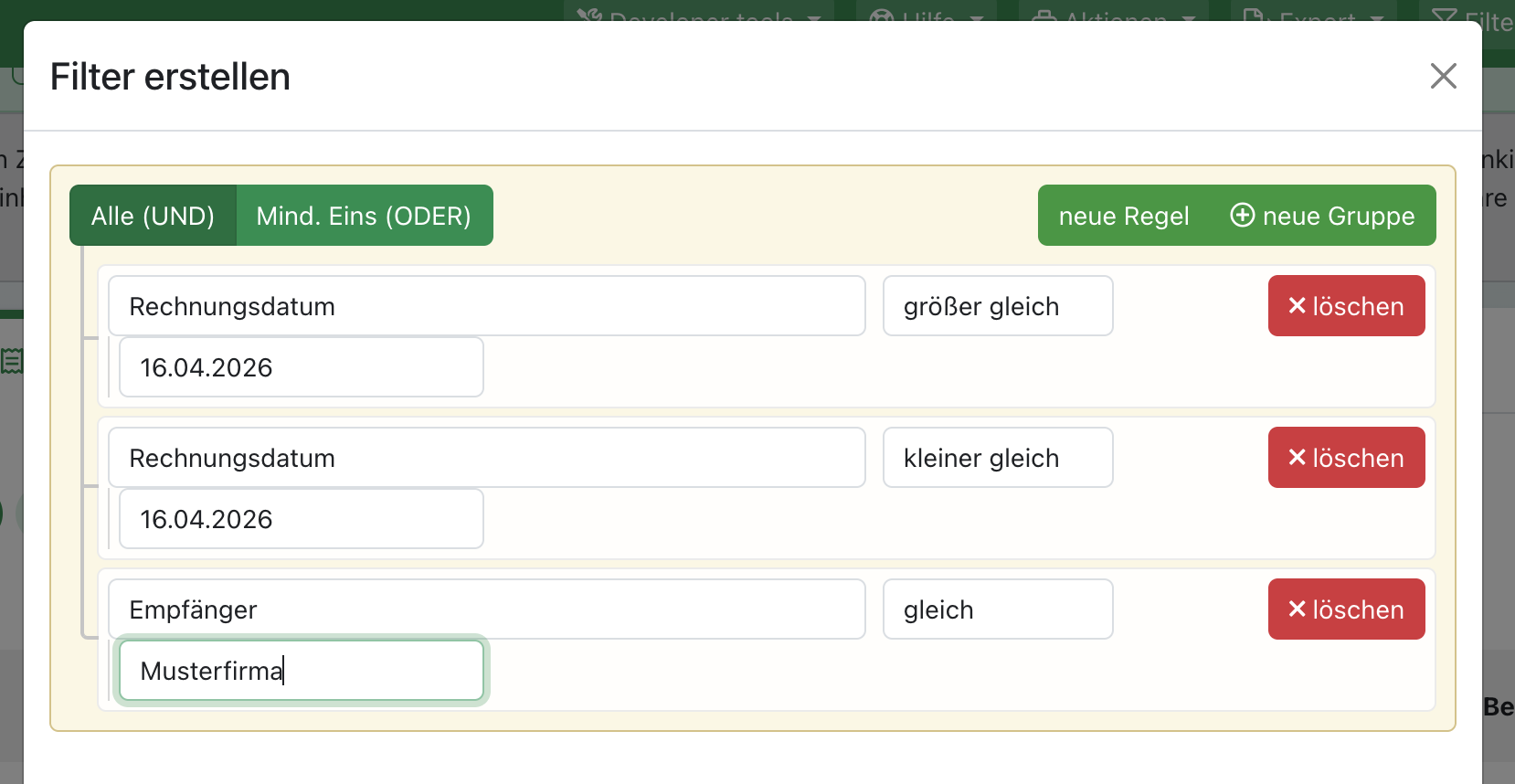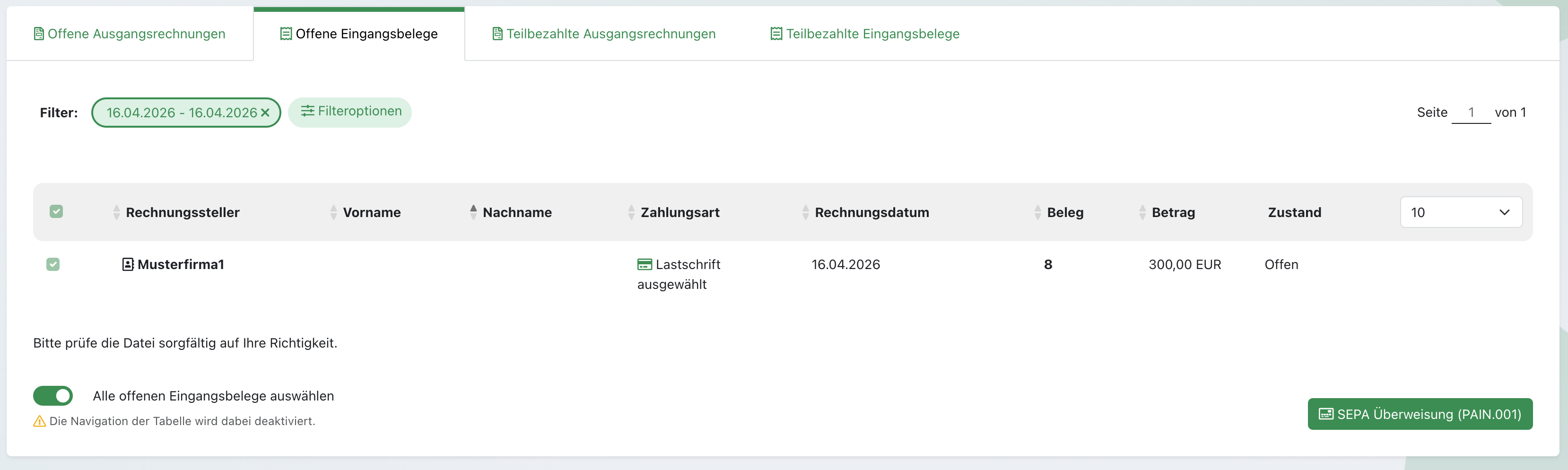 Wir empfehlen, die gewünschten Belege für den Überweisung soweit möglich über die Filterfunktion zu filtern. Möchtet ihr beispielsweise alle am 16.04.2026 generierten Belege einer bestimmten Firma überweisen, könnte der Filter so aussehen: