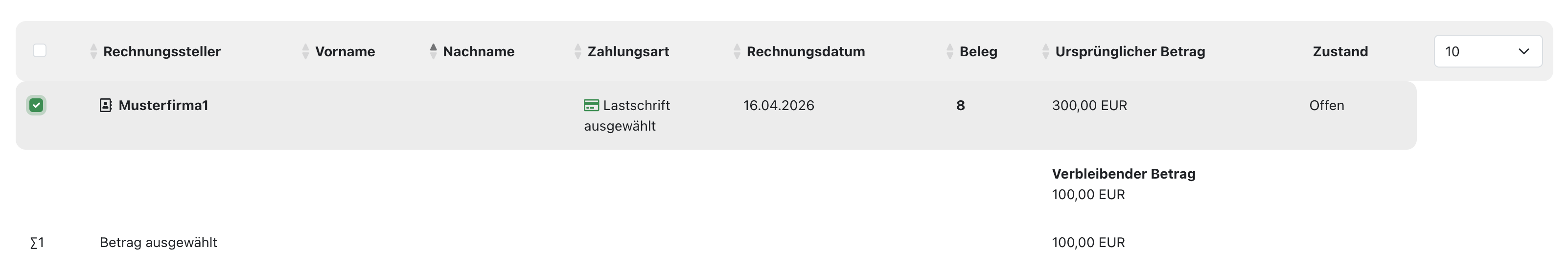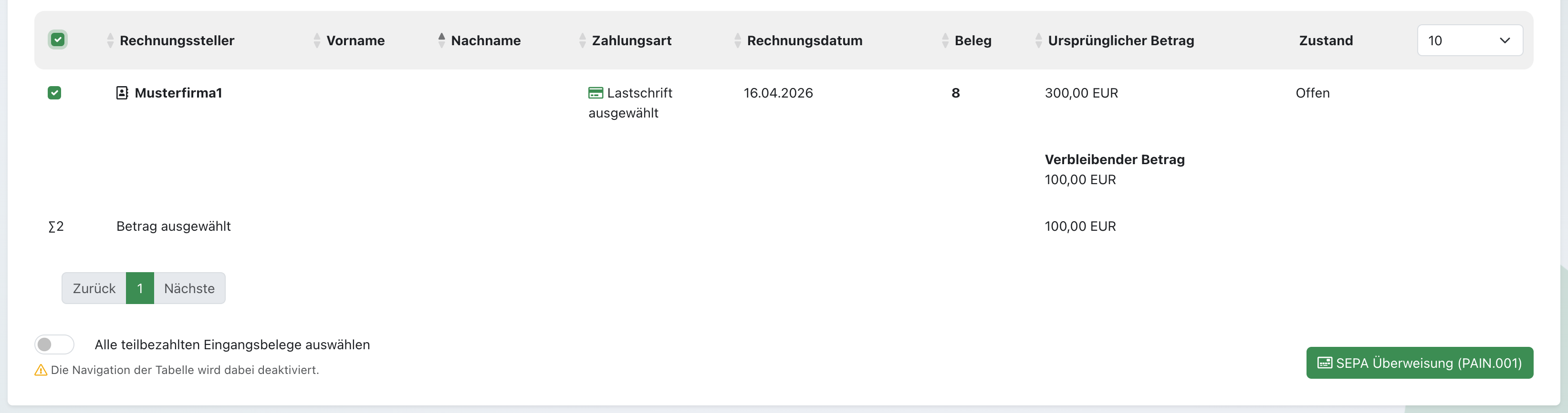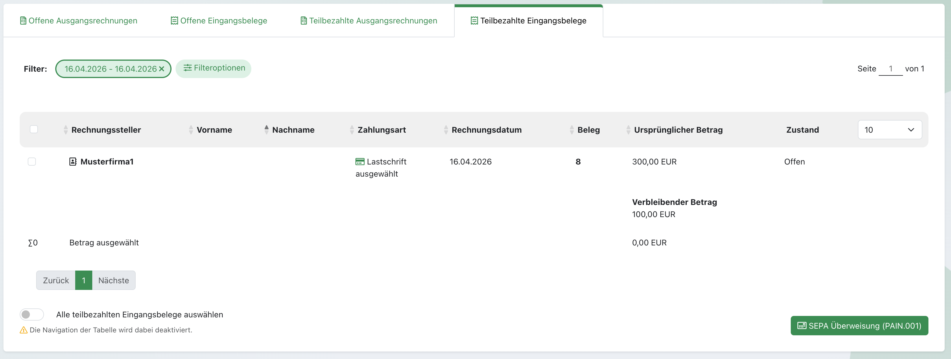Im Bereich der teilbezahlten Eingangsbelege werden euch alle Belege angezeigt, die zwar bereits mit einer Zahlung verknüpft, aber noch nicht vollständig gebucht (bezahlt) sind. Über die verbleibenden Beträge kann eine SEPA-Überweisungsdatei erzeugt werden
