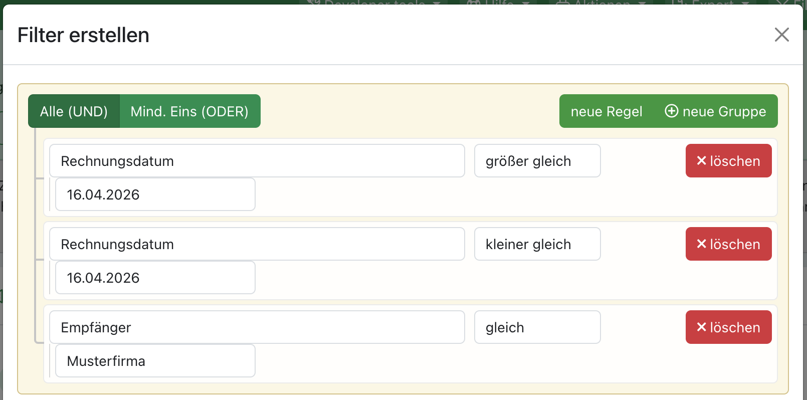 Wir empfehlen, die gewünschten Belege für den Überweisung soweit möglich über die Filterfunktion zu filtern. Möchtet ihr beispielsweise alle am 16.04.2026 generierten Belege einer bestimmten Firma überweisen, könnte der Filter so aussehen: