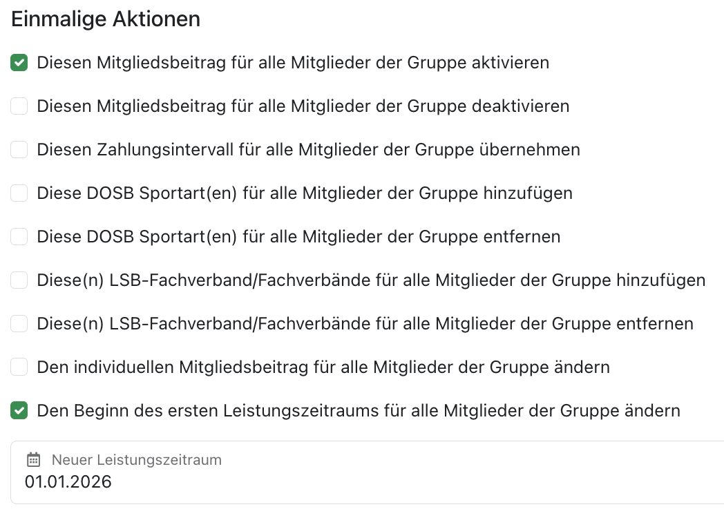 Setzt unten am besten direkt die Einstellung "Diesen Mitgliedsbeitrag für alle neu hinzugefügten Mitglieder aktivieren". Um den Beitrag auch für Mitglieder zu aktivieren, die der Gruppe schon zuvor angehörten, bearbeitet die Gruppe und setzt im Bereich "Einmalige Aktionen" folgenden Schalter und definiert dabei, falls nicht bereits geschehen, auch den ersten Leistungszeitraum für alle Gruppenmitglieder: