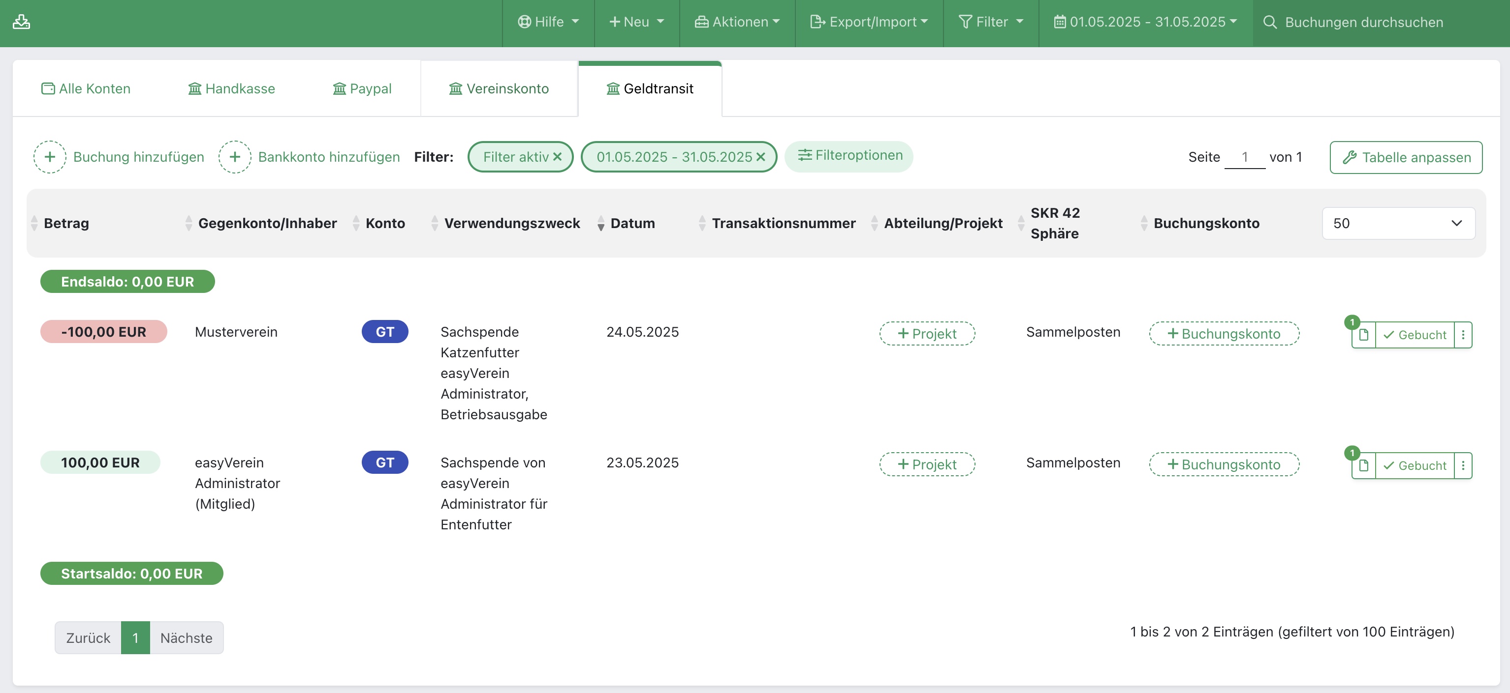 Klickt bei eurer Buchung zur Spende auf der Seite der Einnahmen & Ausgaben auf "Buchen":
