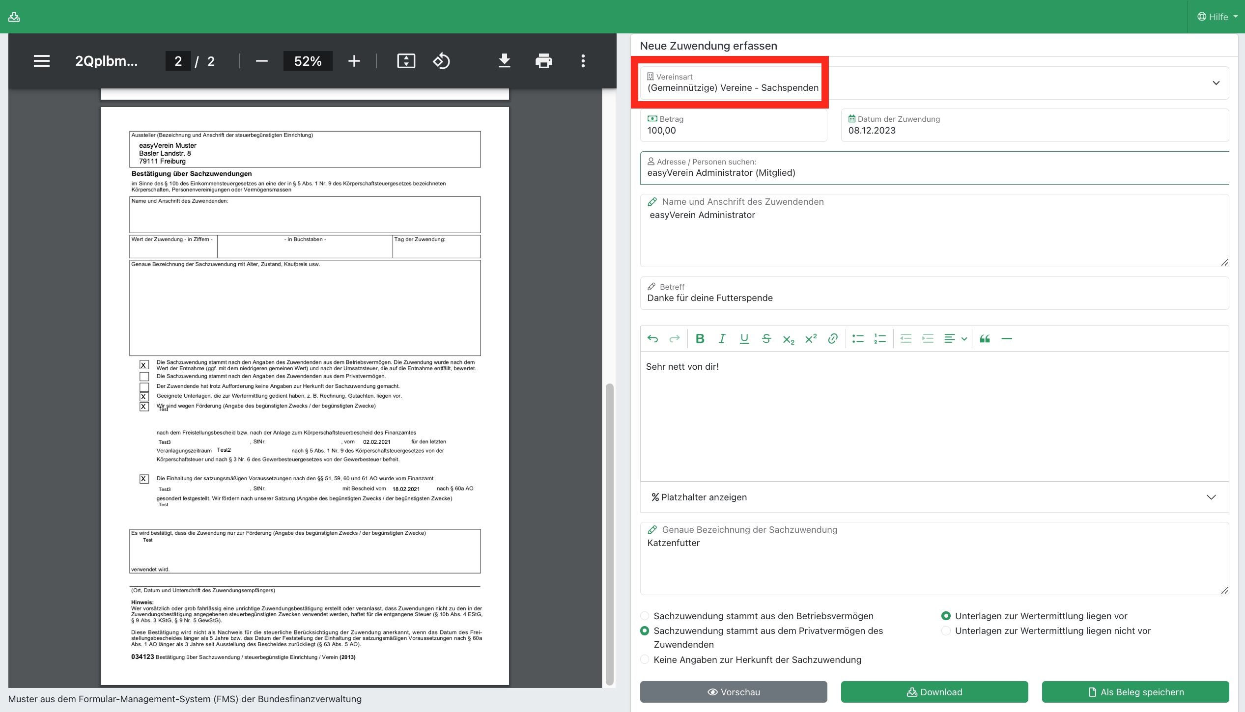 Seit 2021 können Zuwendungsbescheinigungen in easyVerein auch rein maschinell, das heißt mit gescannter Unterschrift, erzeugt werden. Voraussetzung ist die Anzeige gegenüber dem Finanzamt. In diesem Fall erspart ihr euch das Herunterladen und manuelle Unterschreiben der Bescheinigung. Nach Eingabe der notwendigen Daten zur Spende, klickt auf "Als Beleg speichern", es öffnet sich direkt die klassische Eingabemaske zum Erfassen eines Beleges und das PDF-Formular ist direkt als Belegbild hinterlegt: