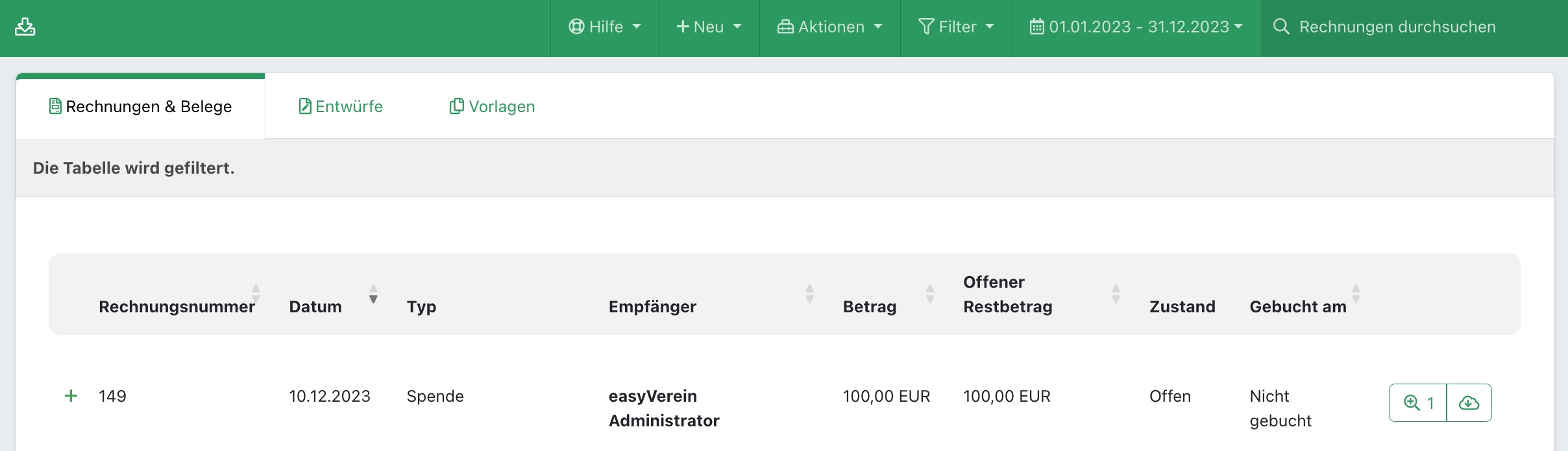 Nach Klick auf "Beleg generieren" wird der Beleg zur Zuwendungsbescheinigung erzeugt und ist danach in der Tabelle der Rechnungen & Belege sichtbar: