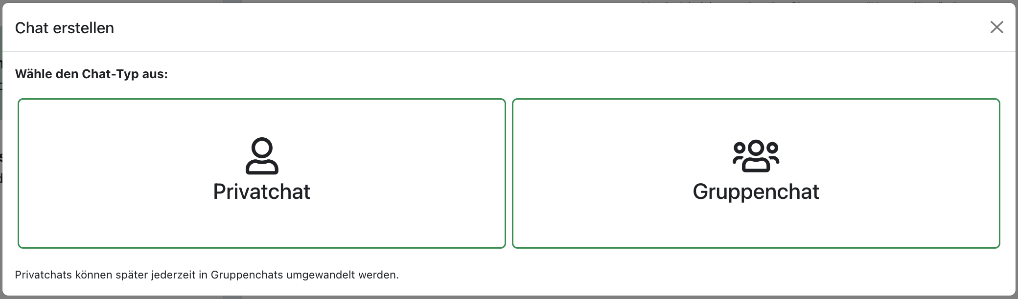 Wählt im Pop-up-Fenster dann zwischen Privat- und Gruppenchat (eine Änderung von Privat- auf Gruppenchat ist auch nachträglich möglich):