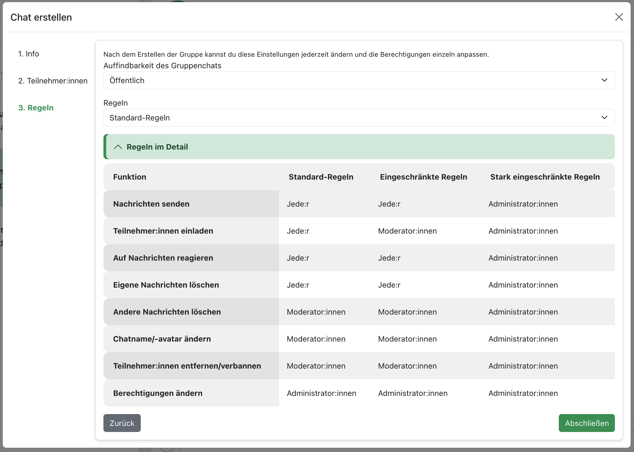 Im Beispiel erklären wir einen Gruppenchat. Wählt hier den Gruppennamen sowie ggfs. ein Gruppenbild, in Schritt 2 wählt ihr dann die gewünschten Teilnehmer aus. Ihr könnt hierbei auch nach vorhandenen Mitgliedschaftsgruppen aus easyVerein suchen. Definiert zum Abschluss die Regeln für euren Chat. Alle möglichen Optionen können unten ausgeklappt werden:
