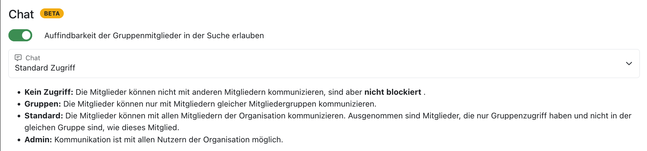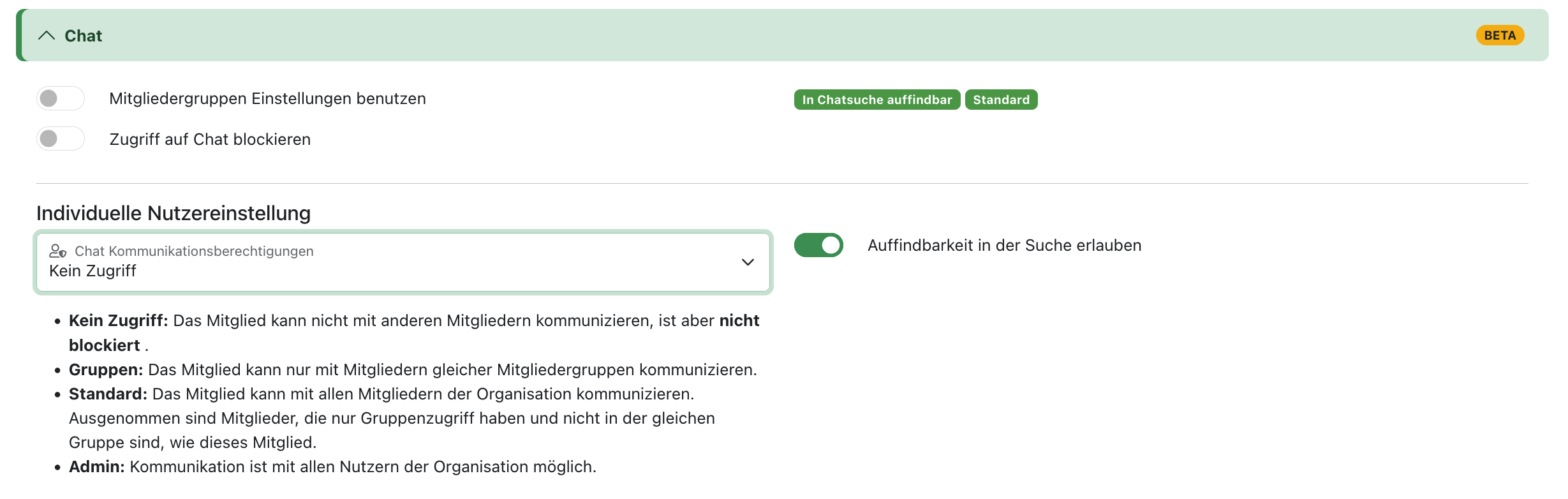 In jeder einzelnen Mitgliedschaftsgruppe in der Gruppenverwaltung können für den Chat individuelle Einstellungen vorgenommen werden. Ihr könnt festlegen, ob die Mitglieder einer Gruppe in der allgemeinen Chat-Suche zu finden sein sollen und welchen Zugriff die Gruppe selbst im Chat als Standard haben soll: