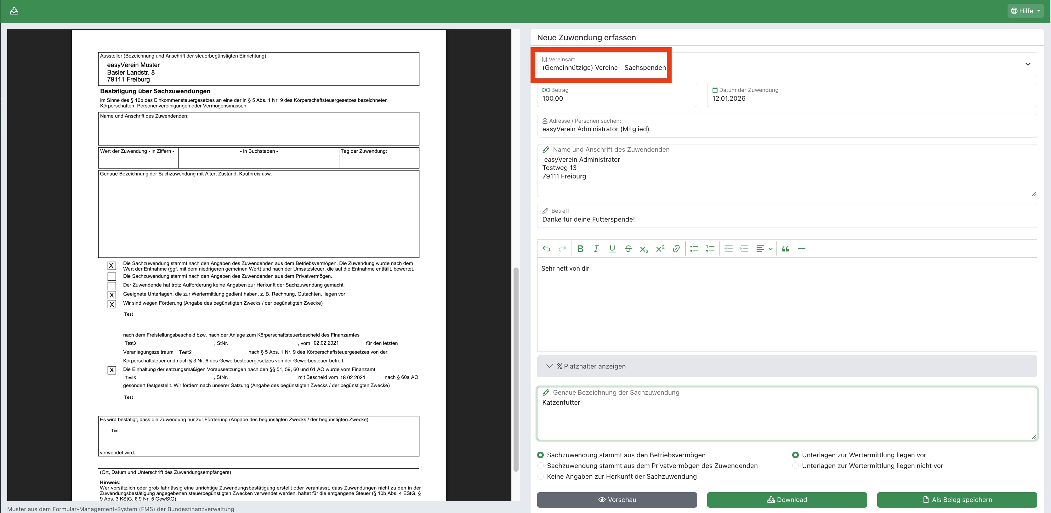 Öffnet über "Neu" und "Zuwendungsbescheinigung" auf der Seite der Rechnungen & Belege zunächst die normale Eingabemaske für Zuwendungsbescheinigungen. Wählt hier dann oben rechts unter "Vereinsart" das Formular für Sachspenden aus: