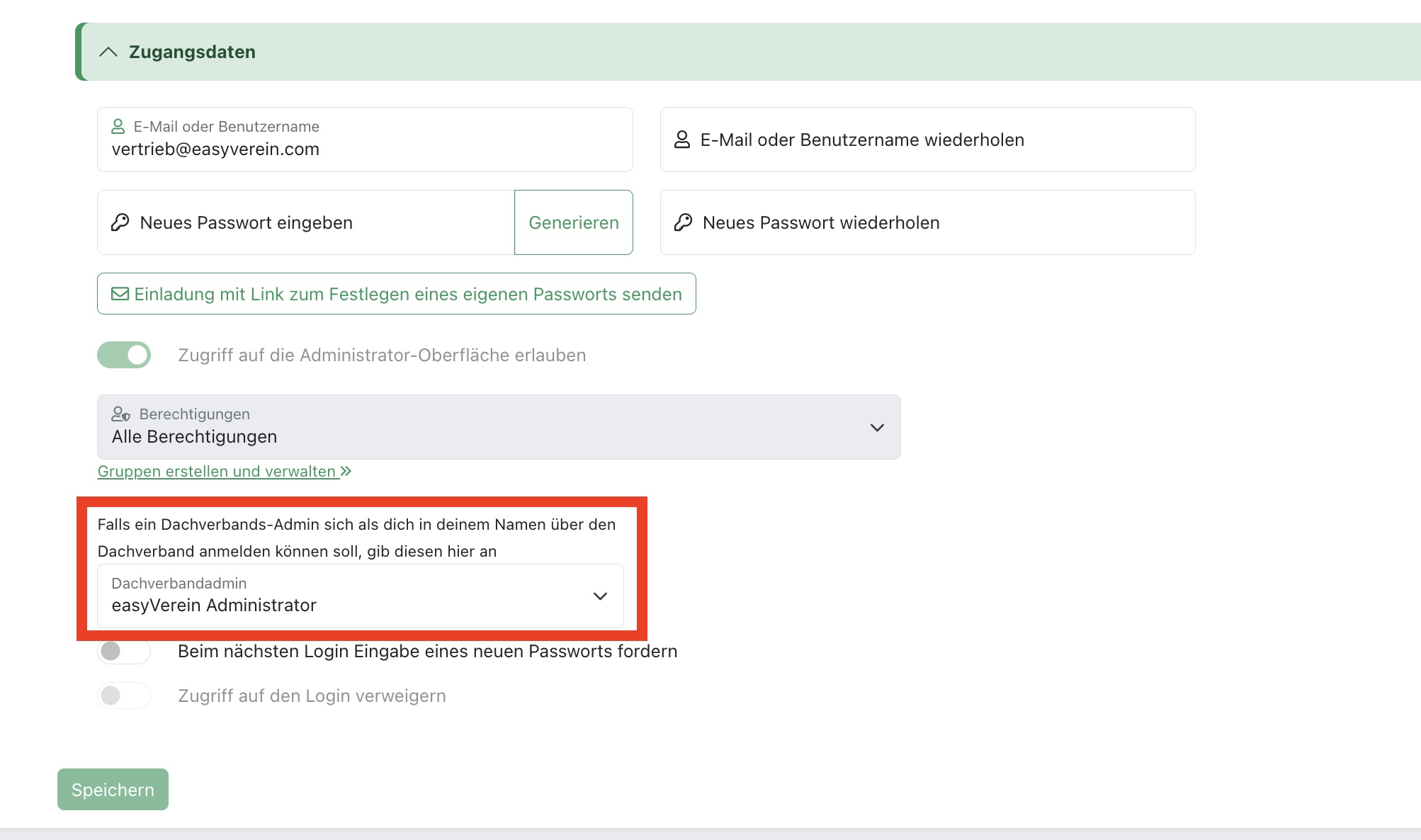 Loggt euch einmalig mit den Zugangsdaten direkt in eure Abteilung an und weist dem Admin-Profil dort im Bereich "Zugangsdaten" den übergeordneten Admin aus Dachverband / Hauptverein zu: